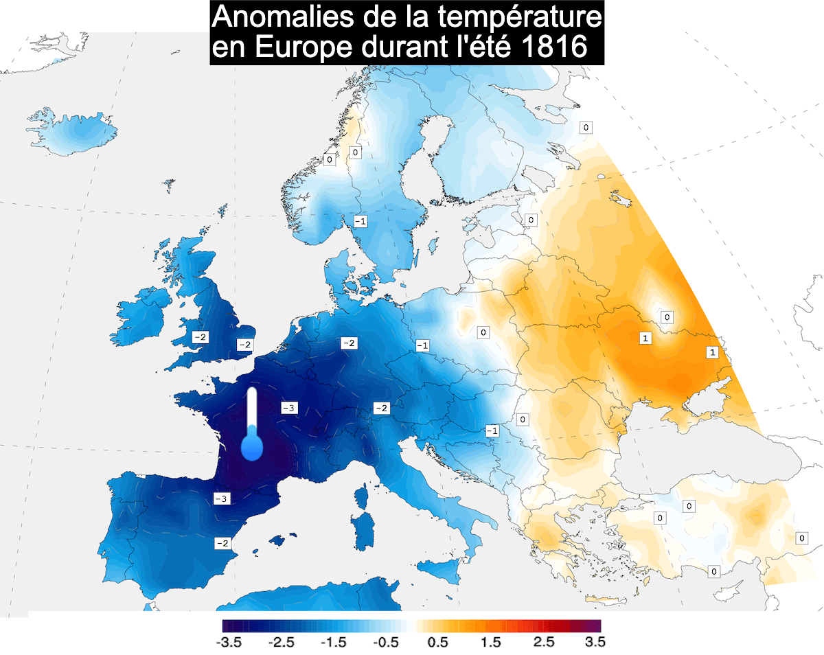 Les scientifiques contemporains évaluent la baisse des températures mondiales entre 1 et 3°C (plutôt 3°C pour la France), une diminution significative sur une période d’une année.  Les particules volcaniques, dispersées dans la stratosphère ont maintenu leur influence jusqu’en 1818, prolongeant ainsi les perturbations climatiques.
