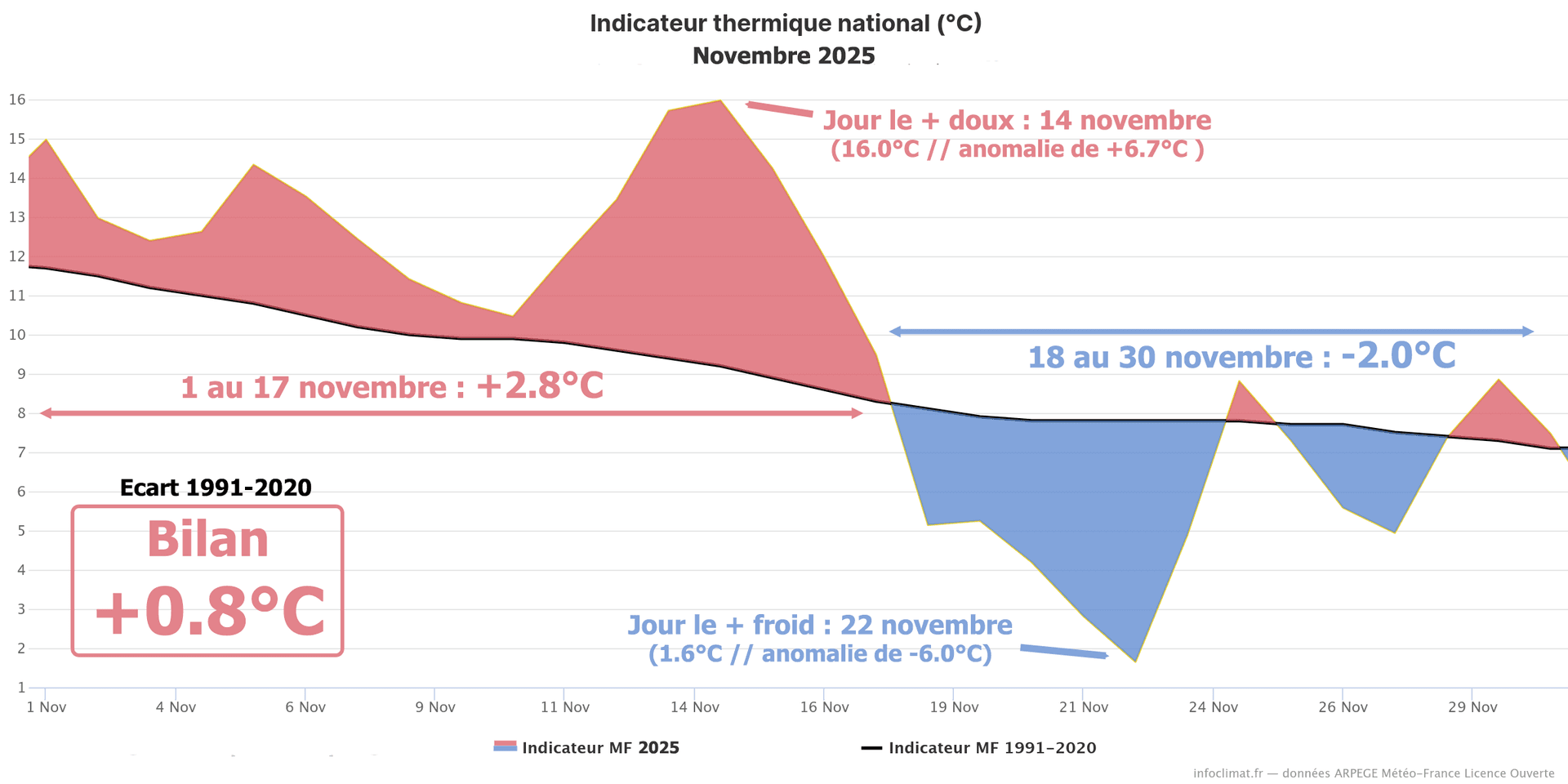 Évolution des températures quotidiennes en France durant novembre 2025 et écart à la moyenne 1991-2020 - Infoclimat