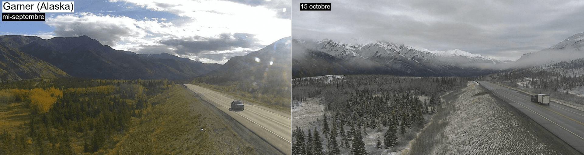 Du côté de l'Alaska, les chutes de neige se montrent de plus en plus récurrentes et les couleurs de l'automne, encore bien visibles durant la première quinzaine du mois de septembre, ont laissé place à une ambiance plus hivernale et la neige recouvre déjà les reliefs.