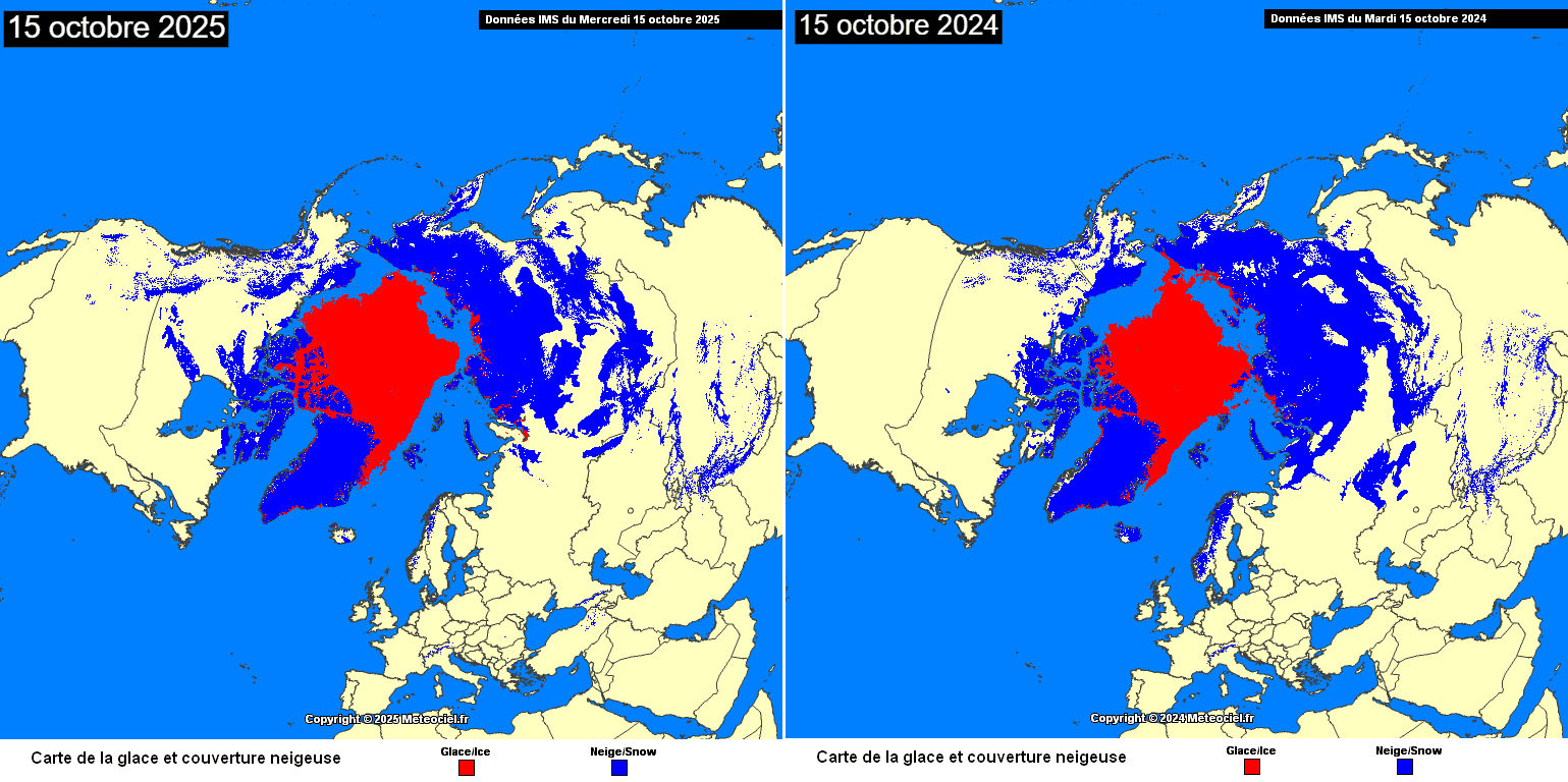 Comparaison de l'étendue de la glace et de la couverture neigeuse sur l'hémisphère nord entre 2025 (à gauche) et 2024 (à droite) – Via meteociel.fr