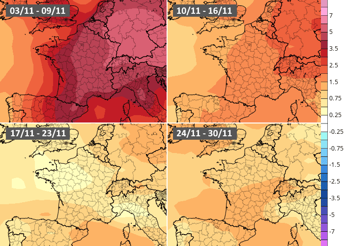 Anomalies thermiques hebdomadaires en novembre 2025 - modèle européen via ECMWF