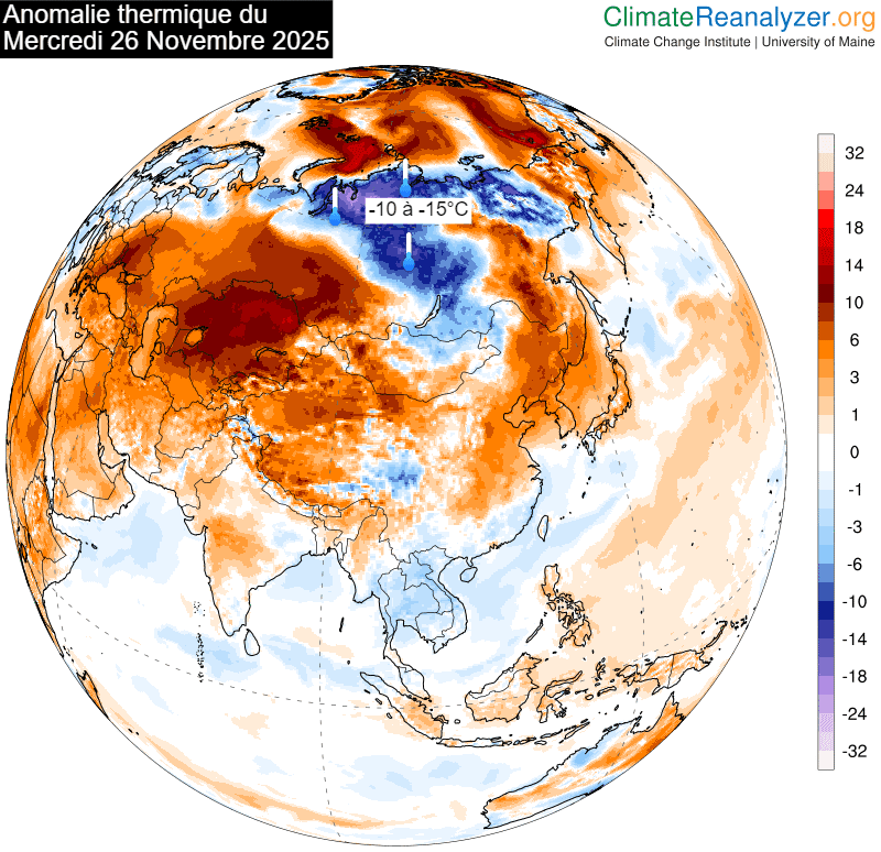 Les températures actuelles en Sibérie se situent en dessous des moyennes de saison. Au mercredi 26 novembre 2025, la Sibérie est d'ailleurs la région du monde qui enregistre l'anomalie thermique négative la plus prononcée avec des températures s'abaissant parfois 10 à 15°C en dessous des moyennes saisonnières. Malgré tout, on ne parle pas de record. Dans ces régions, il a déjà encore plus froid à plusieurs reprises en cette saison. À Delyankir, les -50,7°C restent loin du record d'un mois de novembre qui est de -56,3°C, soit 5,6°C plus bas.