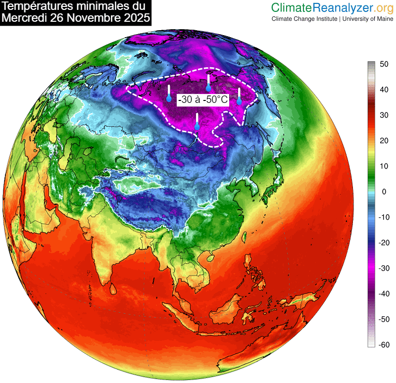 Ce mardi 25 novembre 2025 fut le premier jour de la saison à atteindre la barre symbolique des -50°C en Sibérie. On a relevé jusqu'à -50,7°C à Delyankir ! Notons aussi -50,0°C à Ust-Nera & Yurty et -49.5°C à Oymyakon. De telles valeurs se trouvent sous les normales de saison mais ne sont toutefois pas records. Dans cette région du monde au climat glacial, les normales de saison tournent plutôt autour de -40°C à cette époque de l'année.