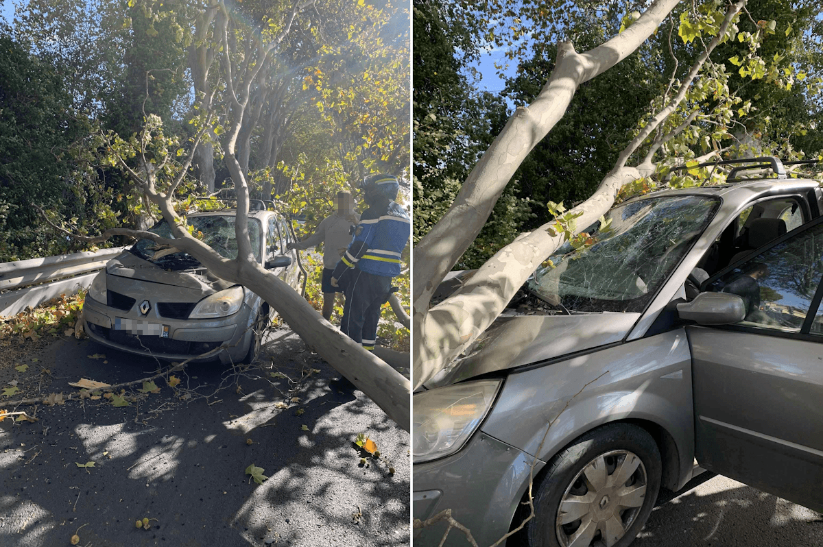 Chute d'arbre sur une voiture à Bessan (34) ce jeudi 23 octobre 2025 - photos Stéphane Pépin-Bonet