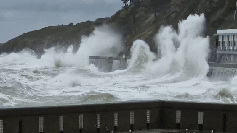 La houle était particulièrement importante en Manche et sur l'Atlantique. À marée haute, quelques phénomènes de submersion ont été observés sur les littoraux les plus exposés. Ce fut par exemple le cas à Granville dans la Manche, comme le montrent les images ci-dessous. Au large des côtes bretonnes, une bouée située au large de Belle-Île a mesuré une houle atteignant jusqu'à 14,4 mètres