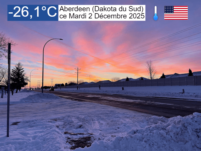 Même si le pic de froid reste à venir pour le Canada et le nord-est des USA, l'air polaire concerne déjà le nord de l'Amérique en ce début décembre. Ce matin du mardi 2 décembre 2025, les températures se sont enfoncées à des niveaux particulièrement froids entre le Canada et le nord des États-Unis. À Aberdeen dans le Dakota du Sud, le thermomètre affichait -26,1°C à l'aube ! Même si cette région d'Amérique est habituée au froid, cette valeur se situe tout de même 15°C en dessous des moyennes de saison !