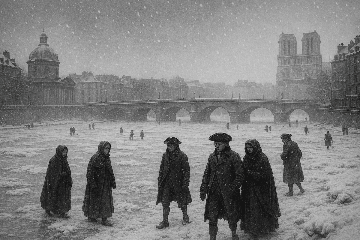 À la fin du mois de novembre 1788, alors que la durée des journées diminue et que les marchés expriment déjà des inquiétudes quant à des récoltes insuffisantes (en raison notamment d’un été exceptionnellement défavorable et de l’orage destructeur du 13 juillet 1788), un vent provenant de l’est traverse subitement la France.  Ce vent transporte de l’air glacial, comparable à un souffle de pierre. En l’espace de quelques nuits, les eaux se solidifient sur les canaux, et le sol, durci, résonne sous le passage des chevaux.