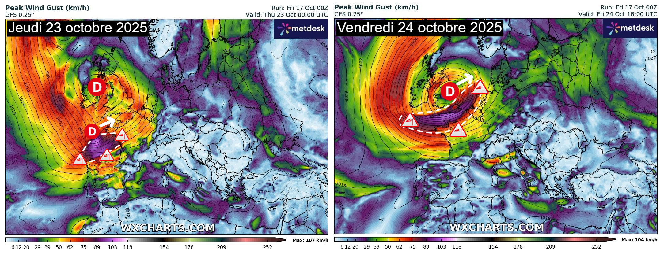 Risque de coups de vent voire de tempête sur la France en seconde partie de semaine du 20 au 26 octobre 2025 – Modèle GFS via WX CHARTS