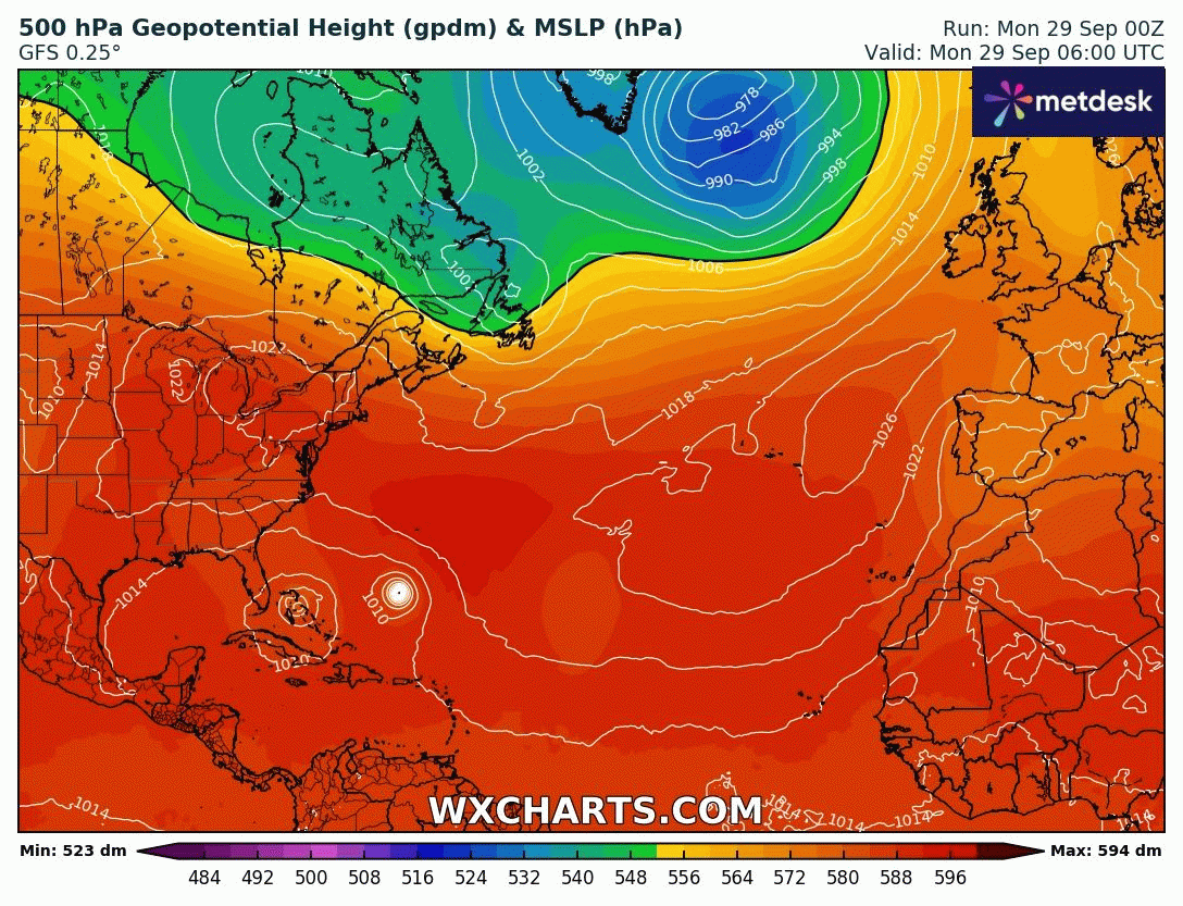 Evolution des geopotentiels sur l'Atlantique entre le 29 septembre et le 5 octobre 2025 – Modèle GFS via WX CHARTS