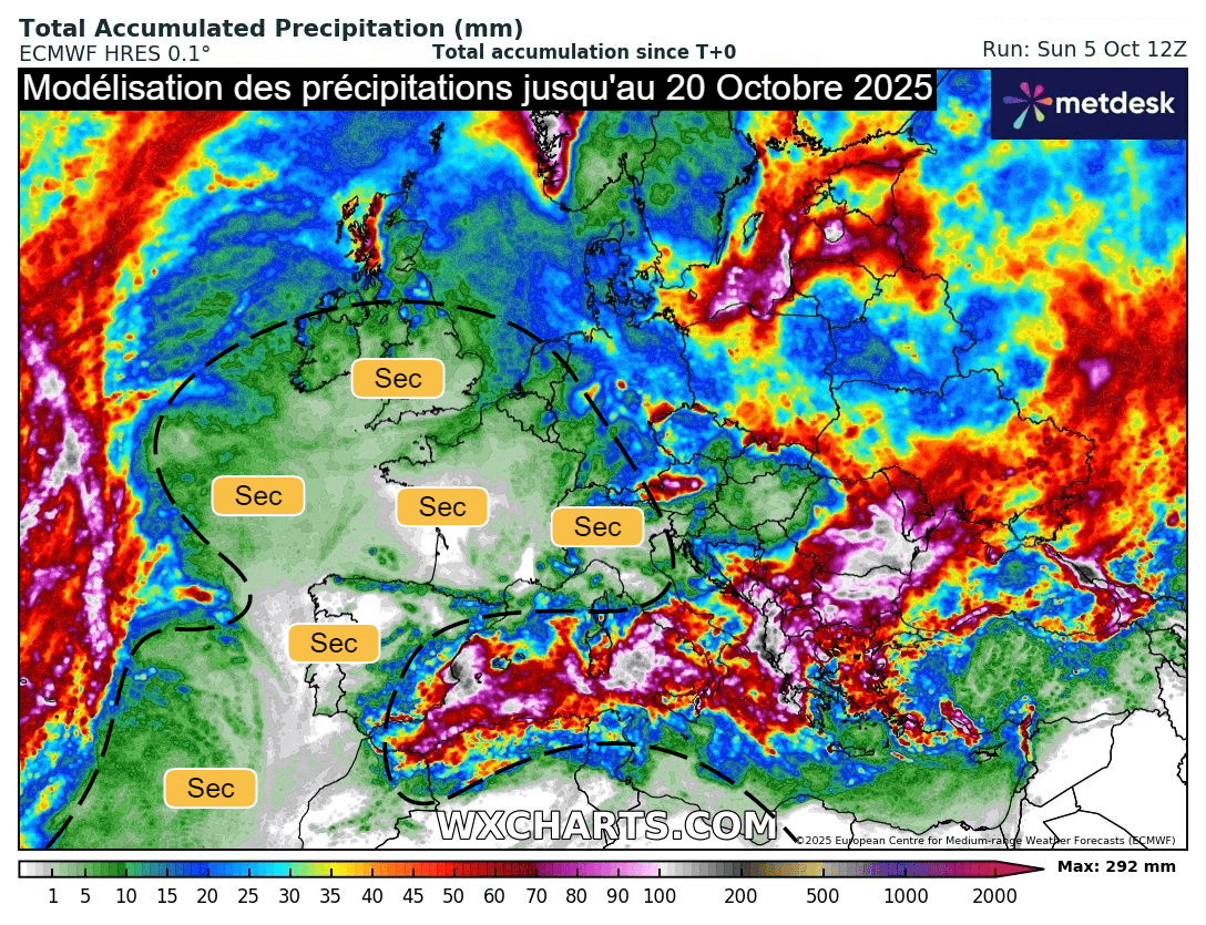 D'ailleurs, les dernières tendances pour ce mois d'octobre 2025 misent sur une anomalie sèche en France, prononcée dans la moitié sud. Notons toutefois qu'on attend davantage d'humidité sur les régions du nord, surtout car plusieurs scénarios misent sur le retour d'une météo plus humide lors de la dernière décade du mois. Cette instabilité pourrait aussi concerner les Îles Britanniques, où la pluviométrie pourrait finalement être excédentaire si la fin de mois est agitée, considérant que les premiers jours d'octobre ont été très arrosés chez nos voisins.