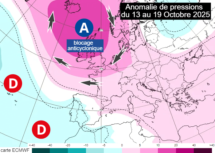 Ce blocage anticyclonique semble parti pour durer. En effet, les modélisations pour la semaine du lundi 13 au dimanche 19 octobre 2025 envisagent le maintien de l'anticyclone sur les Îles Britanniques, s'étendant peu à peu vers le nord en direction de l'Islande. Un flux d'est sec se maintiendrait donc sur la France, où les journées sèches et lumineuses auraient toujours l'avantage. Les basses pressions pourraient peu à peu gagner la péninsule ibérique. Il faudra alors surveiller, à terme, des débordements nuageux voire humides près de la Méditerranée.